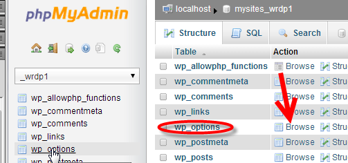 When it opens you will see something like the image below. You are looking at all the tables in the database, think of them as folders containing all the information on your website on bits of paper. Click browse next to wp_options