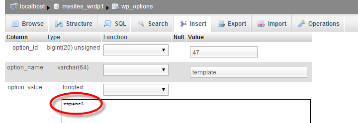 You need to edit the field named template. See it circled below? The current theme title is on the right where the arrow says "theme" in this case it is 'rtpanel'. To reset your site we are going to set the theme to one called twentyten.